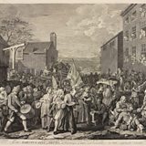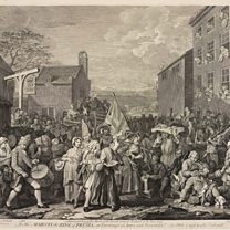 In December 1750, William Hogarth issued a print called The March to Finchley. Set in 1745, the engraving shows government soldiers marching out of London to counter the Jacobite rising led by 'Bonnie Prince Charlie' (Prince Charles Edward Stuart). Buyers of the print would have known that this challenge to Hanoverian rule ended at the Battle of Culloden in 1746, and Hogarth's engraving can be read as a celebration of that victory. Look more closely, though, and things are not so simple. The soldiers in the foreground are in disarray – drunk, dishevelled and marching in many different directions, their gestures parodying events of battle such as beating a retreat and being captured. And the print is dedicated not to the monarch who oversaw the victory – George II – but to Frederick the Great, the king of Prussia. What is going on?