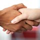 Men shake hands while patting each other on the right shoulder with their left hands.
