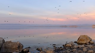 On our last evening we head down to the near-level shoreline to film the lines of pelicans flying in against the warm desert sky. The land we are standing on has been an arid dustbowl of desert; a sea floor brimming with fish and life; and a holiday beach decorated in bright towels - all in little over 100 years.