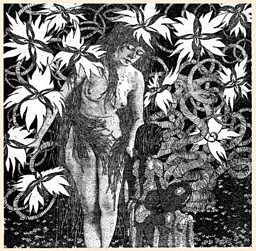 This is no ordinary woman but a creature of timeless origins: green cat’s eyes, three-fingered claws, brown-skinned and wearing scarlet leather.