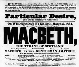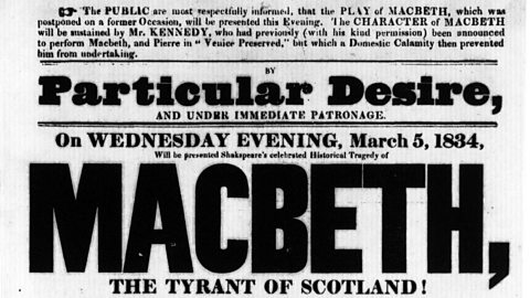 This 1834 Salisbury Theatre playbill starts with an apology: “The public are respectfully informed that the play of Macbeth which was postponed on a former occasion will be presented this evening. The character of Macbeth will be sustained by Mr Kennedy who had previously (with his kind permission) been announced to perform Macbeth…but which a domestic calamity then prevented him from undertaking”.