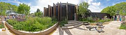 Oak and charred oak are combined with limestone surfaces and sparkling water to complete the design as a garden of sensory delight. Tall oak panels create a sense of elegance and oak and hazel coppice with woodland fruit contrast the drama of the colour swathe that splashes across the garden.
