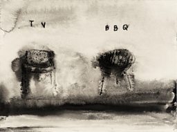 Equally whimsical is the watercolour TV BBQ (2009) which depicts an old TV set and a barbeque side by side. Lynch smudges each object, bringing out the similarity between the two: propped up by spindly legs, the appliances resemble a pair of hovering insects, or even a pair of B-movie spaceships touching down.