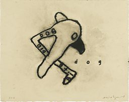 Dog (2012) shows a Surrealist influence: it is a single shape which is made up of a composite of different forms: these could be crossed limbs, an animal head, and what looks like a hockey stick with the legend 'dog did bite' running up its side.