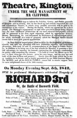The playbill represents Kington theatre manager Mr Clifford’s 'pitch' for his newly renovated and 'commodious', theatre staging Richard III in 1842.