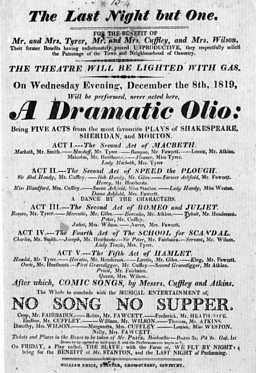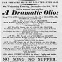 This playbill presents a 'dramatic olio', a selection of extracts from well-known plays written by popular dramatists: Shakespeare, Sheridan and Morton.