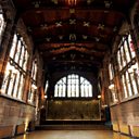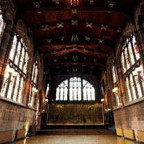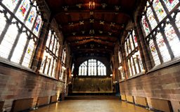 When the bombs fell on Coventry in November 1940, destroying three-quarters of the city centre and St Michael’s Cathedral, St Mary's Hall in narrow Bayley Lane directly across from the Cathedral, miraculously survived. The arched entrance from the street still leads to a courtyard with the red sandstone hall on the upper storey in the west range, the entrance via a narrow, winding staircase accessed through a door in the east range.