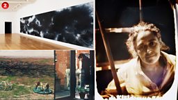 Tacita Dean, Woman with a Red Hat. Clockwise from top left: When First I Raised a Tempest, installation at Fruitmarket Gallery, 2018, Photo Ruth Clark / Tacita Dean Portrait © Jim McHugh / A Muse, short film, 2017