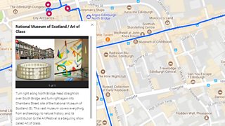 Turn right along North Bridge, head straight on over South Bridge, and turn right again into Chambers Street, site of the National Museum of Scotland (5). This vast museum covers everything from archaeology to natural history, and its contribution to the Art Festival is a beguiling show called Art of Glass.