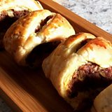 Rolaig an fhèoil a-mach na chumadh isbein airson ‘s gum freagair e air meud na duilleig taoise. Cuir an isbein feòile air muin am mustard agus rolaig suas san taois e. Suath beagan uisge ris an oir airson a dhùnadh.