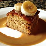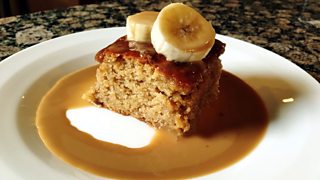 Sgeadaich a chèic le slisean banana is sabhs tofaidh stiogach. Cuir an t-ìm, an uachdar agus siùcair ann am pana agus teasaich iad gus an goil iad. Tionndadh sìos an teas an uair sin agus leig leis bruich air shocair fhèin (mu 4 mionaidean) gus am bith dath breagha tofaidh air.