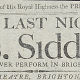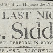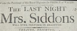 This playbill records a visit by the major star, Sarah Siddons, to the Theatre Royal in Brighton where she played Lady Macbeth. Siddons was born in Wales and became the best-known tragedienne of the 18th century. She was John Philip Kemble’s older sister. She became famous for her portrayal of Lady Macbeth.