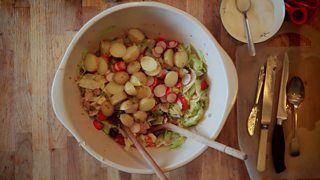 The Mitchell-Cotts are whizzes when it comes to sourcing fresh ingredients on a budget. Here, they share their recipe (and quirky method) for making a nutritious and budget-balancing tuna nicoise salad.