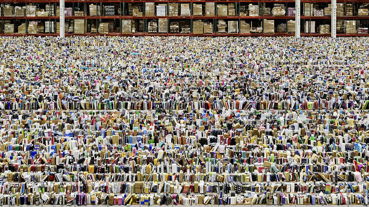 We're standing infront of Amazon, one of the more recent pictures in this exhibition. It's not a photo of the river, but one of the online behemoth's innumerable warehouses. Gursky isn't interested in creating pretty pictures - he photographs the world we really live in.