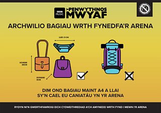 - Rydyn ni’n archwilio pob bag sy’n dod i’r digwyddiad. Rydyn ni wedi cyfyngu maint y bagiau sy’n cael eu caniatáu er mwyn gwneud hyn yn haws – un bag i bob person, ddim yn fwy na maint A4. Efallai y byddwn ni hefyd yn chwilio bagiau unwaith rydych chi yn yr arena.