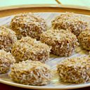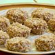 Leagh an t-seòclaid. Bheir na pìosan a-mach às an fhuaradair agus còmhdaich iad le seòclaid agus an uairsin cnò-còco.
