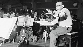 In the BBC picture archive I found a wonderful relaxed photo of the composer rehearsing with the BBC Symphony Orchestra at Maida Vale studios in 1958. From his suede loafers to his fluffy cardigan, he is the epitome of avant-garde cool.