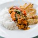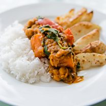 10. Rhyw 1/4 cyn bod y cyri a'r sglodion yn barod rinswch y reis mewn dŵr oer tan fod y dŵr yn glir, rhowch e nôl mewn i'r sosban yna adiwch mwy o ddŵr. Dim ond rhyw hanner modfedd uwchben y reis sydd angen. Yna berwch y dŵr ac unwaith mae'r dŵr wedi beri trwoch y gwres lawr mor isel a gallwch, dylai’r reis fod yn barod o fewn 10 munud. Cadwch lygaid a chofiwch roi clawr ar y sosban!!
