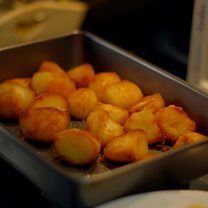 4. Pour the vegetable oil into a roasting tray and place into the oven for 5 - 10 minutes to heat up. When hot carefully remove the roasting tin and gently add the dried potatoes to the pan, one by one and listen to them sizzle. Season with a pinch of sea salt and place them back into the oven for around 45 minutes, making sure to turn them at least once during the cooking time.