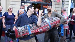 These performers found an eye-catching way to promote their drama Family Values, at theSpace on the Mile.