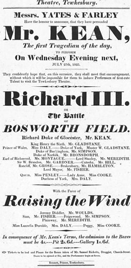 The author of the playbill knows he’s attracted a stellar talent to Tewkesbury, describing Kean as the “first tragedian of the day”.