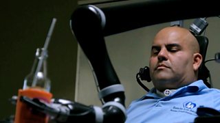 These allow Erik to control a robot arm using just the power of his thoughts, an example of how science is already merging the human and the machine.