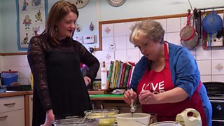 Nis, cuir làn spàin mhòr de gach measgachadh fear ma seach, bàn agus ruadh, ann an tiona cruinn seachd òirleach. Cho luath ‘s a tha bonn an tiona air a còmhdachadh cùm ort a’ cur am measgachadh, fhathast spàin ma seach, air uachdar seo a’ dèanamh cinnteach gu bheil thu a’ cur spàin dhen mheasgachadh ruadh air uachdar am fear bàn agus am fear bàn air uachdar am fear ruadh.