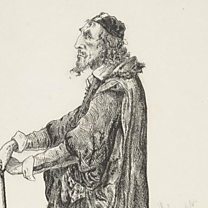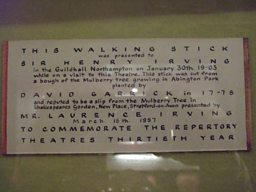This walking stick was presented to Sir Henry Irving in 1903 when he visited the theatre for three days and performed in The Merchant of Venice. He added it to his collection of items that he had related to David Garrick.