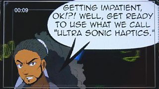 Vince realised he could employ a haptic hand sensor to enable users to interact with what they see on screen. Users learn to make different objects - including characters - move in different ways by moving their hand differently. The project is brought to life by a set of comic-book style illustrations which add a layer of narrative to the journey.