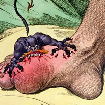 In ‘Enchantments lately seen upon the Mountains of Wales’ (1796), the goatish Prince of Wales’s reconciliatory embrace with Princess Caroline bears testament to his political venality. ‘The Republican Rattle-snake fascinating the Bedford-Squirrel’ (1795) shows a serpentine Charles James Fox tempting the naïve (and furry) Duke of Bedford into his gaping maw. And in ‘Democratic Levelling’ (1796), the marriage between Lady Stanhope and a freakish apothecary assembled from medical equipment symbolizes the worst ‘levelling’ tendencies of revolutionary reform.