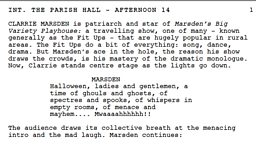 On the day, the hall was full of extras and our principle characters. We had rehearsed the monologue without the crowd. No-one in the audience knew what was going to happen. The lights went down, the crowd went quiet, and the wonderful Niall Buggy as 'Clarrie Marsden' made his surprise entrance from the back of the hall - no one knew what was about to happen. Faces turned, and the silence became deathly. Carrie walked to the stage, he stood in the middle with his back towards the audience for a few seconds - then turned. His voice boomed out. “Halloween! Ladies and gentlemen”- an old actor about to do his turn!