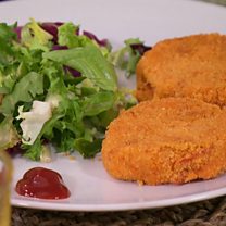 Coat the cakes in egg and then cover them in breadcrumbs. Drizzle with oil.