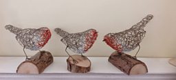 Even though the wire is galvanised, she paints them with primer and undercoat so they will survive being outside. She then paints a couple of top coats and then the finished models are mounted on branches.
