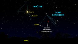 Makemake is a very red trans-Neptunian object. It has an orbit similar to that of Haumea, inclined at about 30 degrees to the plane of the planets. It has an average diameter of 1,400 km and an average distance from the sun of 45 astronomical units. This is where you'll find it during July and August 2017, with a magnitude of +17.1.