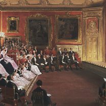 In front of the monarch, sitting obediently in a row are the Royal children whose eyes are transfixed by the actress centre-stage. This is likely to be Lady Macbeth in one of her most dramatic scenes.