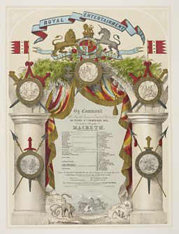 There is also the playbill from that particular performance on Friday 4th February, 1853. This bill is beautifully illustrated with roundels showing scenes from Macbeth, and depictions of the witches’ “familiars” in the form of a snake, a cat, and a strange frog-like creature adorning the base of the pillars.