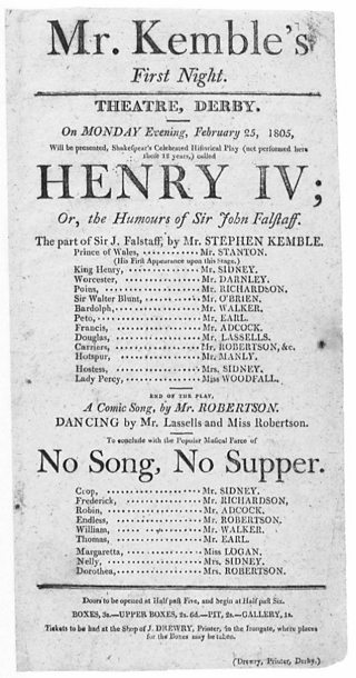 That family was the Kembles and as this playbill from Derby Theatre dated Feb 1805 shows, playing the leading role was another of this famous acting dynasty, Stephen Kemble.