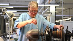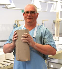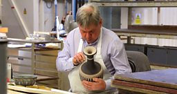 Neil Burton has worked as a Turner at Wedgwood for 44 years. Here he is applying adhesive to attach the neck of the vase to the base.
