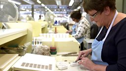 Susan Green, Figure Maker. Sue has worked as a Figure Maker at Wedgwood for 45 years. The clay is rolled, knocked into moulds and pressed, the excess clay is then scraped off before the leaves are coaxed out.
