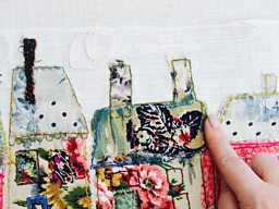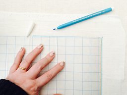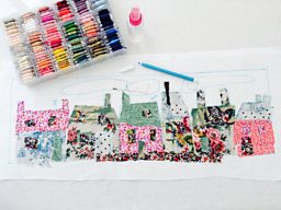 Now your fabric is stuck to your base white linen or cotton fabric within the guidelines you've marked yourself, use your water soluble pen to mark out the lines you want to stitch to create your design. Use back stitch and a mixture of colourful threads to create your stitched drawing