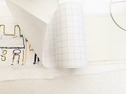 What you will need: a 20cm lampshade kit, scissors, embroidery thread, needle, fabric scraps, bondaweb, water soluble pen, water spray, plain white linen or cotton