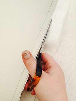 Remove the tape from the top and bottom of the fabric carefully and roll the fabric round the hoops using your hand in a claw shape, trying to tuck as much of the fabric around and underneath the hoop as possible. If you have strong long nails then they will help you