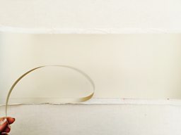Remove the red plastic protective side of the tape from the hoops leaving the sticky tape on the hoops. Place the hoop with the circular light attachment on the bottom of your design with the fitting facing inwards, the plain hoop goes on the top. This is for a table light, if you want to make a ceiling light do the opposite. Now roll your hoops along the edge of the plastic lining all the way to the end of your lining. Start rolling from the edge without the tape towards the edge with the tape. When you get to the end, remove the tape from the edge and stick the two edges together with an overlap so the shade is now joined as a complete circle
