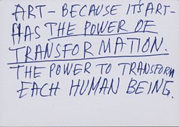 The famous names include Bob & Roberta Smith, Maggi Hambling, Zandra Rhodes, Richard Long, Thomas Hirschhorn, Susan Hiller, Christo, David Bailey, Yinka Shonibare, Ryan Gander, Paula Rego, Nick Park, James Dyson, Norman Ackroyd, Paul Smith and Joseph Kosuth.