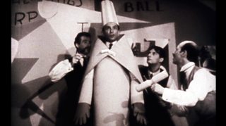 Vic gives a solo performance of Hugo Ball’s Karawane in 'cubist bishop' costume