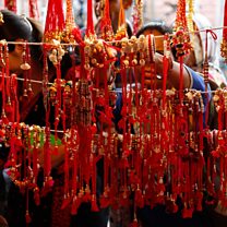 The rakhi is traditionally made from interwoven red and gold threads, and today the bands are often decorated with stones and beads and embellished with other colourful silk strands.