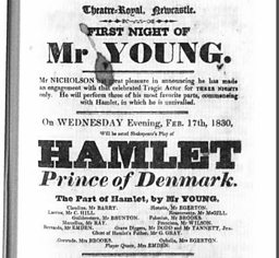 Later Mr Young left Drury Lane and here we catch him appearing in Newcastle. Perhaps the encounter with Kean and intervening years added a complexity to his interpretation of Prince Hamlet.