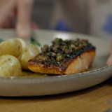 6. Plate up the salmon alongside some steamed tenderstem broccoli and new potatoes. Spoon the sauce over and enjoy.