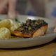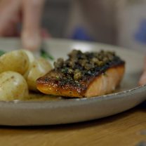 4. Gently turn the fish over and add a knob of the butter to the pan. Next add the juice from half a lemon. Using a spoon, baste the salmon with the butter. Remove the fish from the pan, place onto a plate and pour over any liquid in the pan.