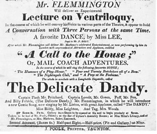After this marvel Mr Flemmington is back on stage to deliver Mr. Mathews's celebrated Entertainment, as now performed by him in London with unprecedented Attraction and Applause, entitled “A Call to the House or Mail Coach Adventures”